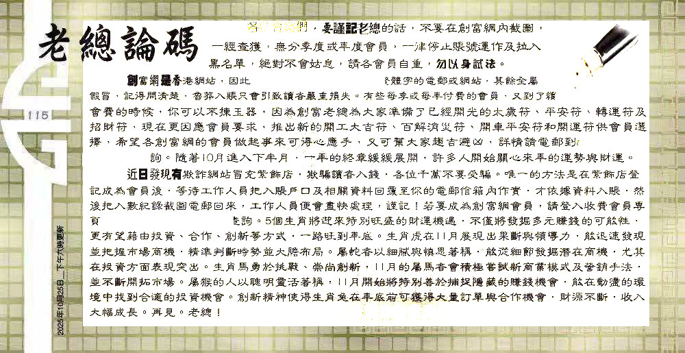 115期:六合皇金句/老总论码/萧公子/林大师/五行夺码/老总信箱截图